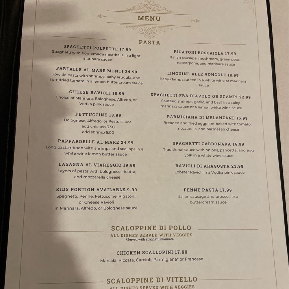 Piccata, Francese, Marsala served with seasonal vegetablesOnly Parmigiana served with pasta in a marinara sauce